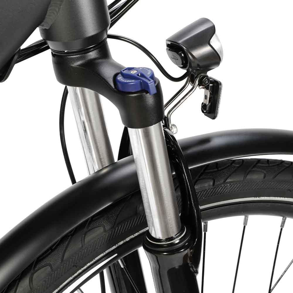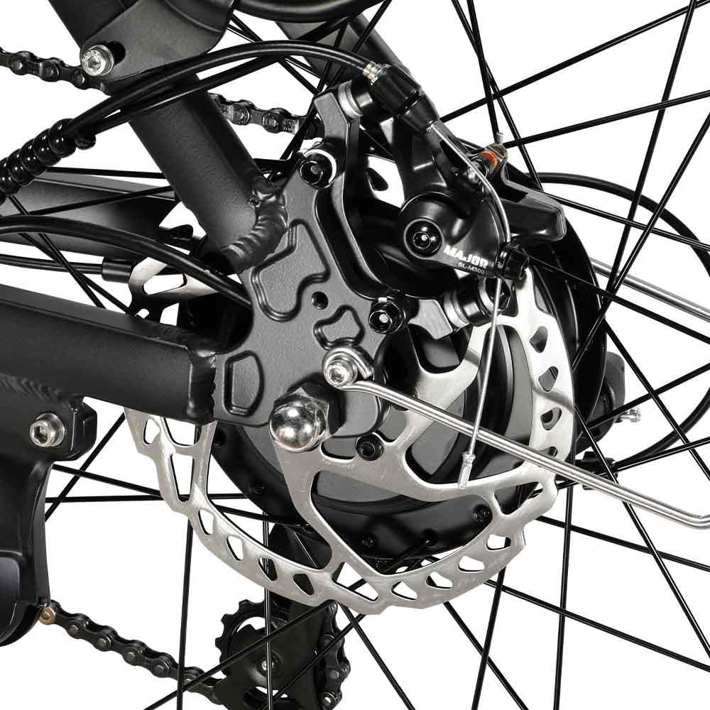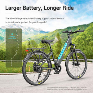 Благодаря съемной литий-ионной батарее 36 В 13 Ач этот электровелосипед обеспечивает увеличенный запас хода до 100 км в режиме помощи, предоставляя достаточную мощность для дальних поездок. 27,5-дюймовые шины обеспечивают отличную устойчивость, а передняя амортизационная вилка с ходом 80 мм поглощает удары, обеспечивая плавную и контролируемую езду по различным поверхностям.